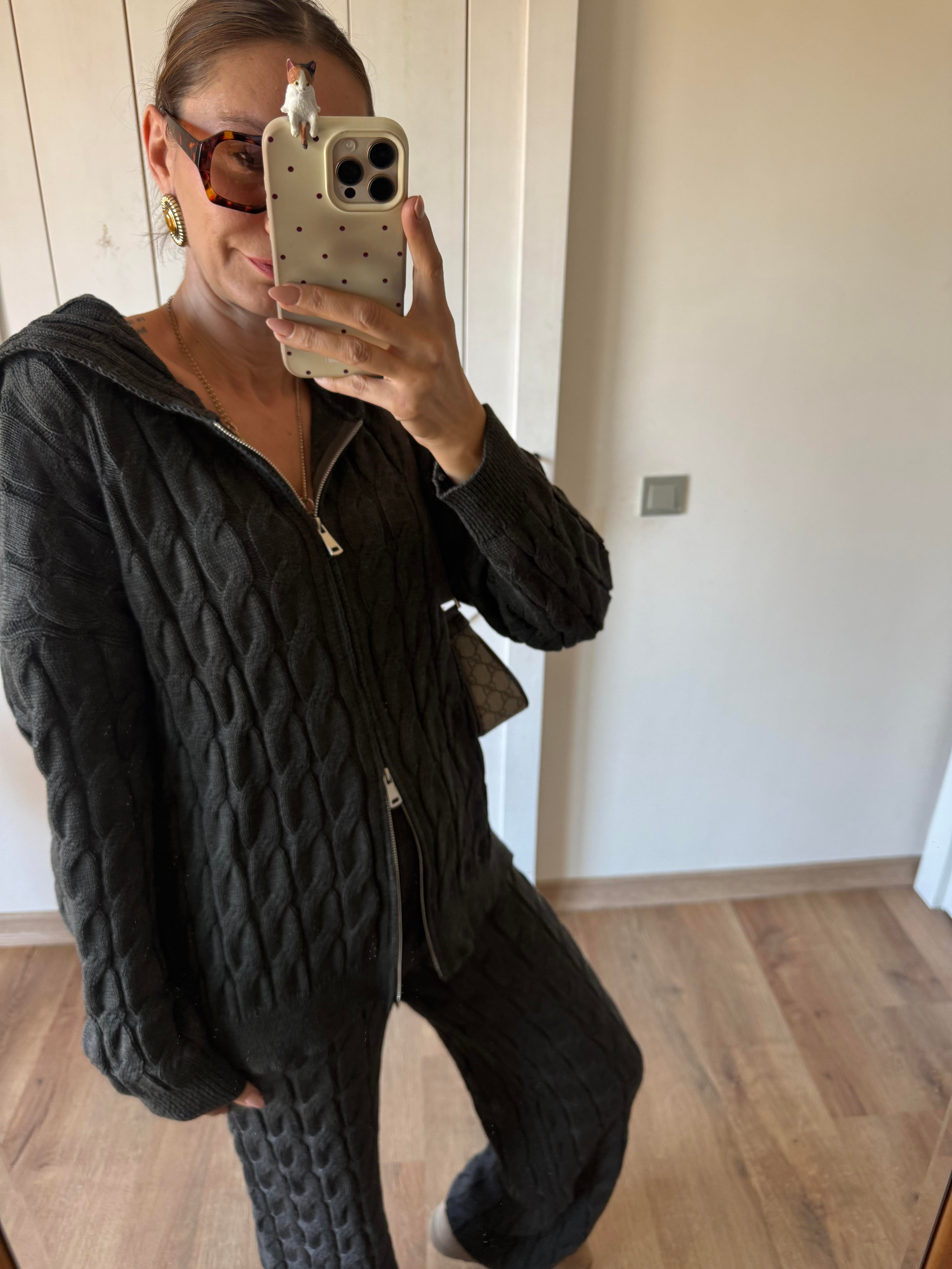 Konforu ve şıklığı bir araya getiren örgü desenli triko eşofman takım, sezonun en sevilen cozy parçalarından biri. Yumuşacık triko dokusu, esnek yapısı ve zarif örgü detayıyla hem evde rahatlıkla hem de şehirde stil sahibi bir görünümle tercih edilebilir.