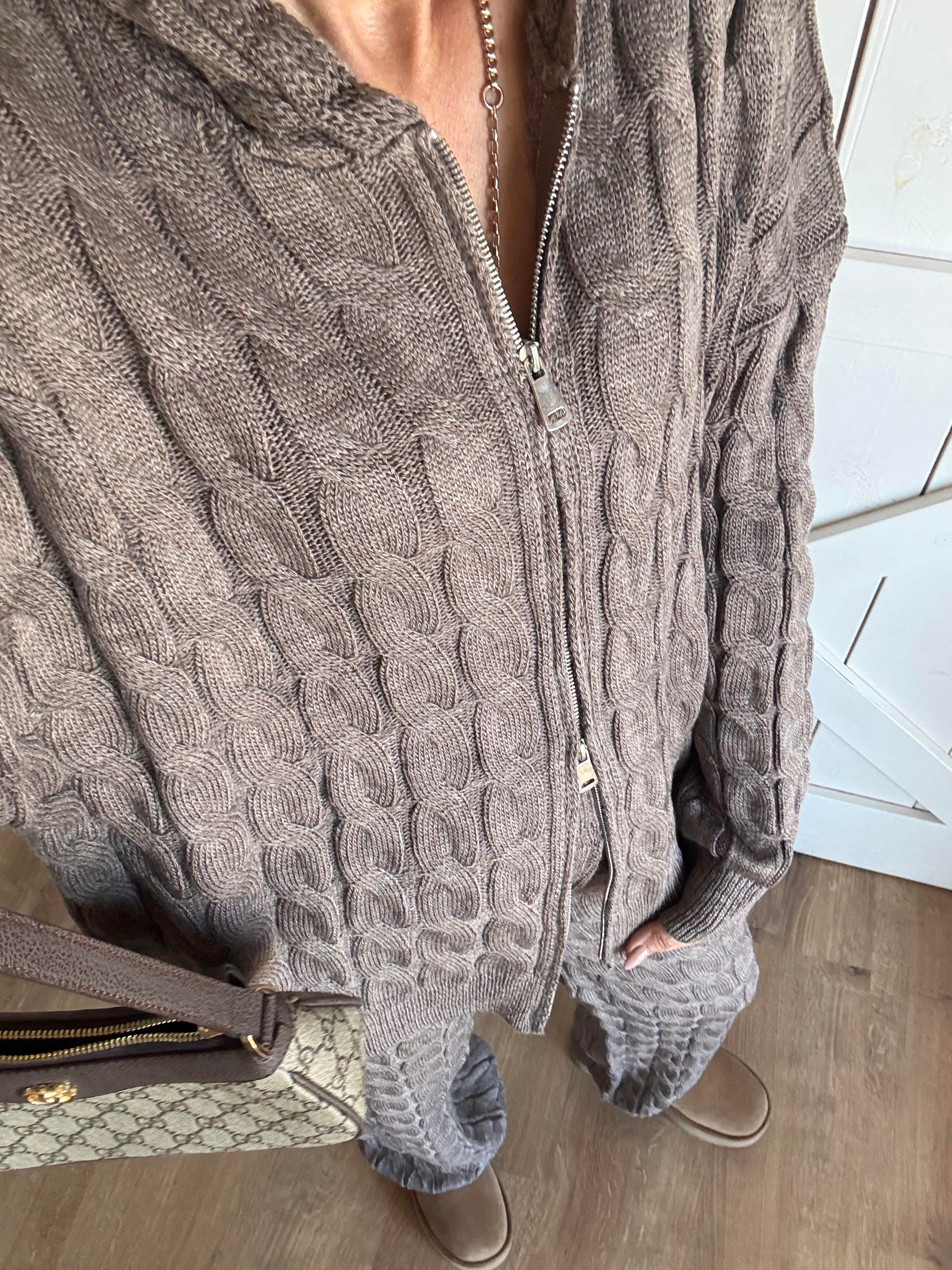Çift Fermuarlı Saç Örgü Triko Takım Sütlü Kahve