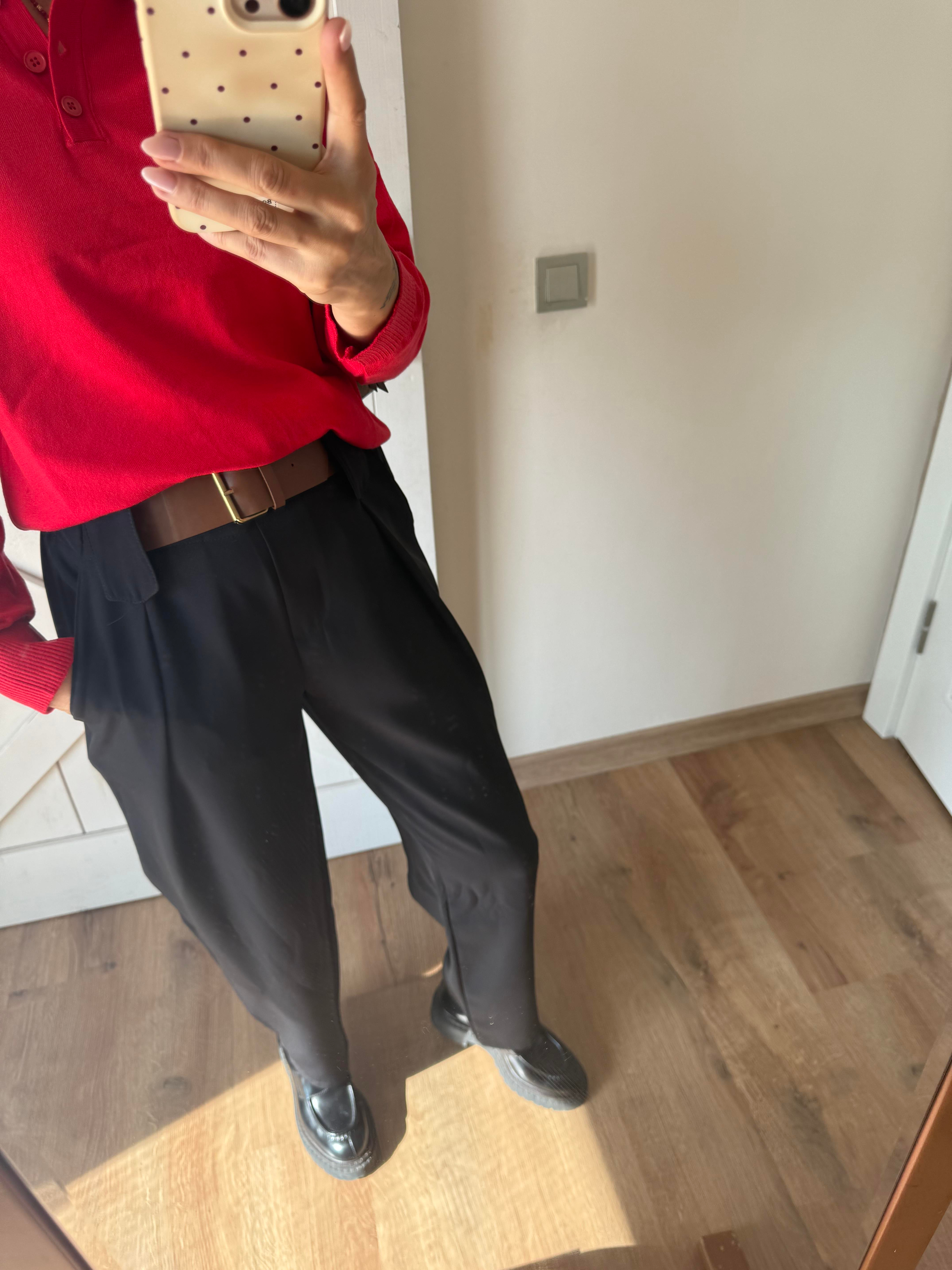 Tam kalıptır. Kemer detaylı arkası lastikli. Ara bedenler bir beden küçük alabilir.