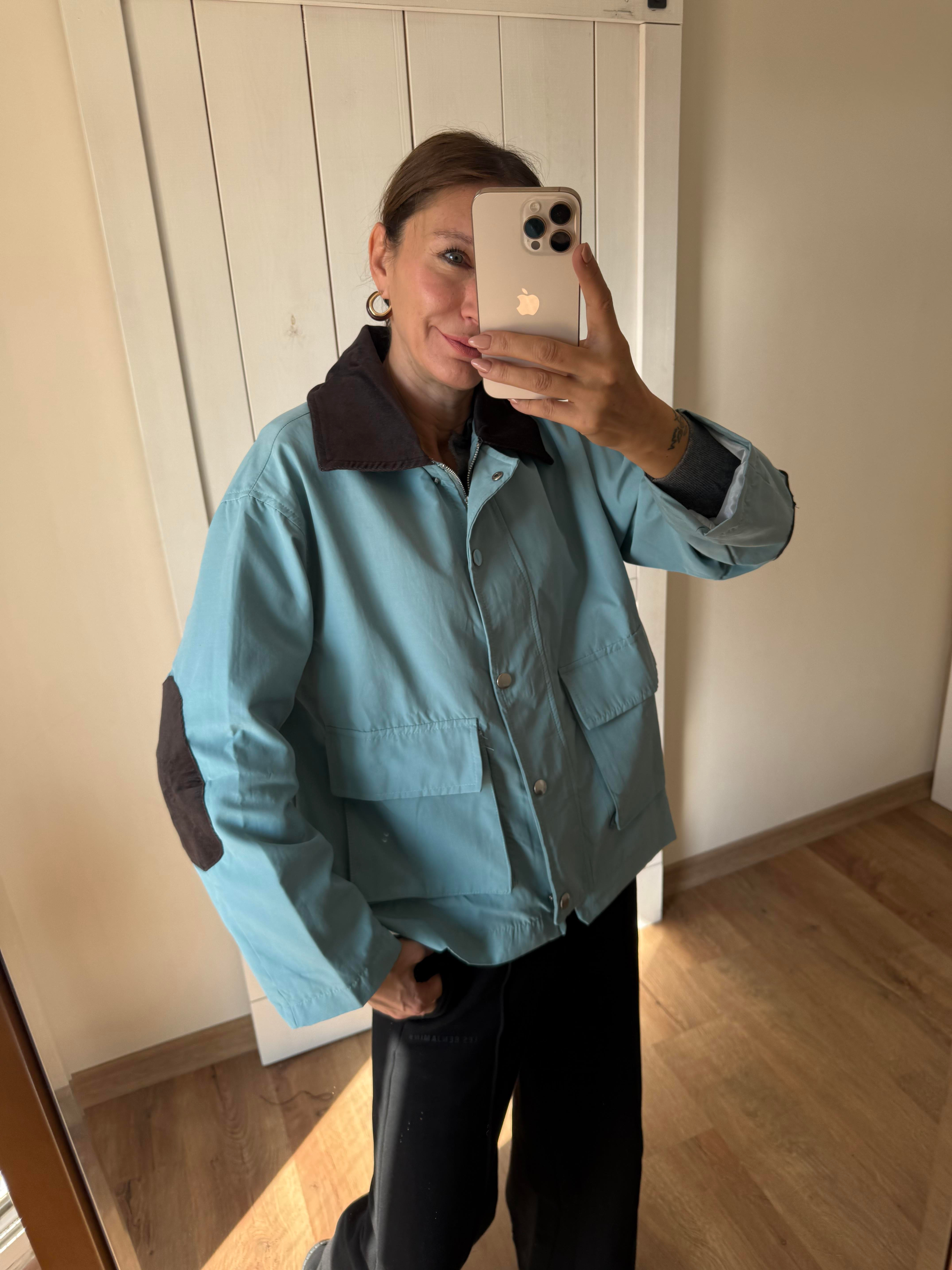 Astarlı, kadife yaka, dirsek yama detaylı marka model trenç. Önden fermuarlı çıtçıt kapama düğmeli.